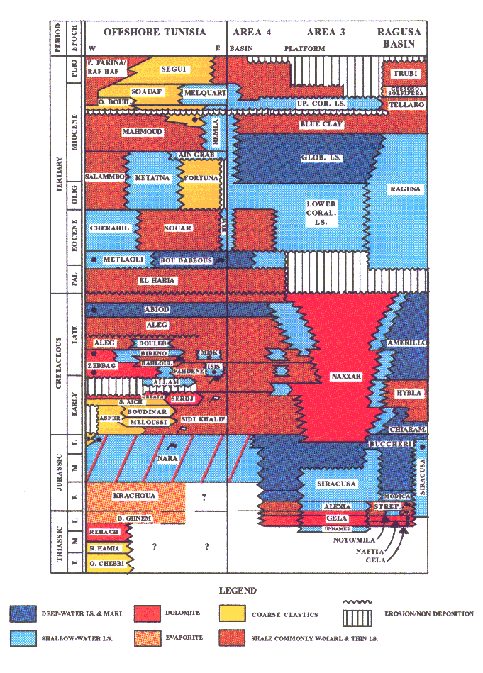 A similar situation is inferred in the south-eastern parts of Area 4 where Jurassic faulting is observed along a NNW-SSE trend cutting through Blocks 5 and 7. Facies differentiation culminated in the Late Cretaceous. Three similar domains developed in regions covered by Area 4 and to the west of it: a platform domain characterised by a monotonic sequence of dolomites and limestones of the Zebbag and Halk el Menzel Formations drilled in Tama-1, an intermediate domain with rudist buildups observed on the shelf edge of the Melita Rise drilled offshore Tunisia (Isis field), and a third domain characterised by Zebbag dolomites overlain by a thick sequence of organic rich shales and limestones of the Fahdene, Bahloul, Aleg el Haria and Bou Dabbous Formation.