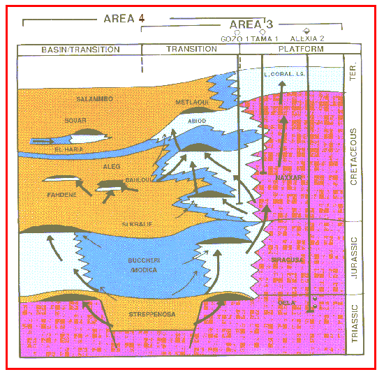Jurassic carbonates of the Siracusa (Vega, Perla) and Nara Formations (El Biban) are expected on the flanks of the Ragusa Basin in Area 3 and the Melita-Medina Basin in Area 4.
